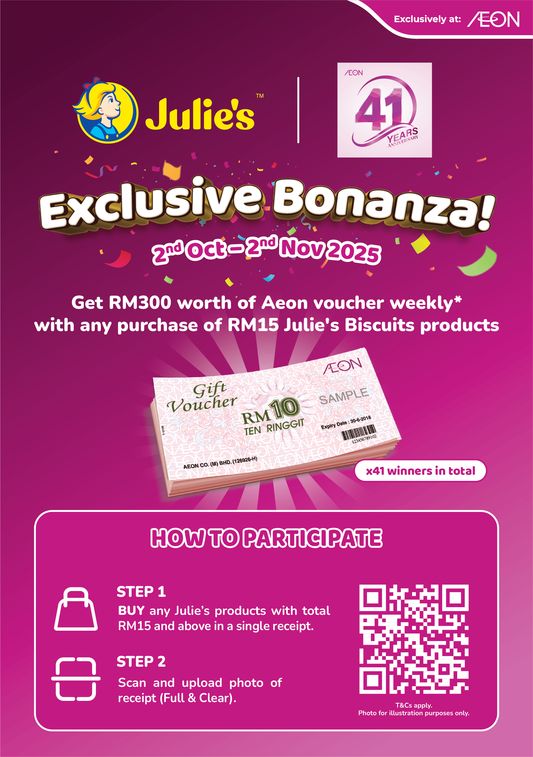 1. Julie’s x Aeon ‘Exclusive Bonanza’ Contest (“Contest”) is organized by Julie's Marketing Sdn. Bhd. (“The Organizer / Organizer”) and is open to permanent residents and citizens of Malaysia (“Participants”) .